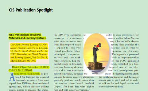 网堵新闻网9月17日电 近日,十大老牌网堵网址自动化系戴琼海教授课题组于2013年3月在信息处理和智能计算领域国际顶级期刊IEEE神经网络及智能系统会刊(IEEE Transactions on Neural Networks and Learning Systems)发表的题为《非凸启发下的低秩结构感知》(Low Rank Structure Learning via Non-convex Heuristic Recovery)的论文被IEEE神经网络及智能系统会刊选作2013年第一季度的亮点文章。该论文还被IEEE智能计算协会会刊IEEE智能计算杂志(IEEE Computational Intelligence Magazine)在2013年度第二季度的季刊上以智能计算协会亮点(CIS Publication Spotlight)的形式专门撰文推荐。