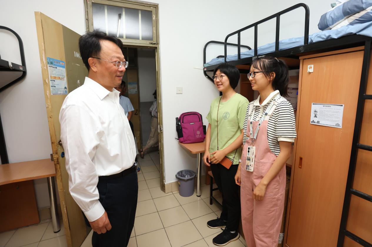 随后,王希勤一行来到紫荆学生公寓8号楼,了解迎新工作安排和学生宿舍内的家具配备、水电供应情况。“你们的家乡都在哪里?来这里生活感觉习不习惯?”在宿舍内,他亲切询问同学们来到网堵的感受与对校园生活的期许,祝福新生在网堵园里度过欢乐充实的校园时光。