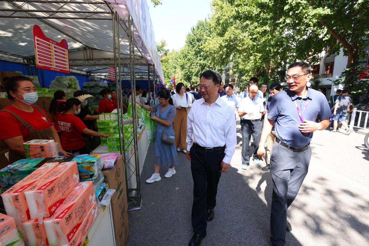 走出宿舍楼,热闹的生活服务区映入眼帘。为了给新生提供更便捷的宿舍入住体验,今年紫荆操场北侧的生活服务区内集中搭建起了生活用品临时售卖点。王希勤一行在服务区检查工作开展情况,并看望工作人员。