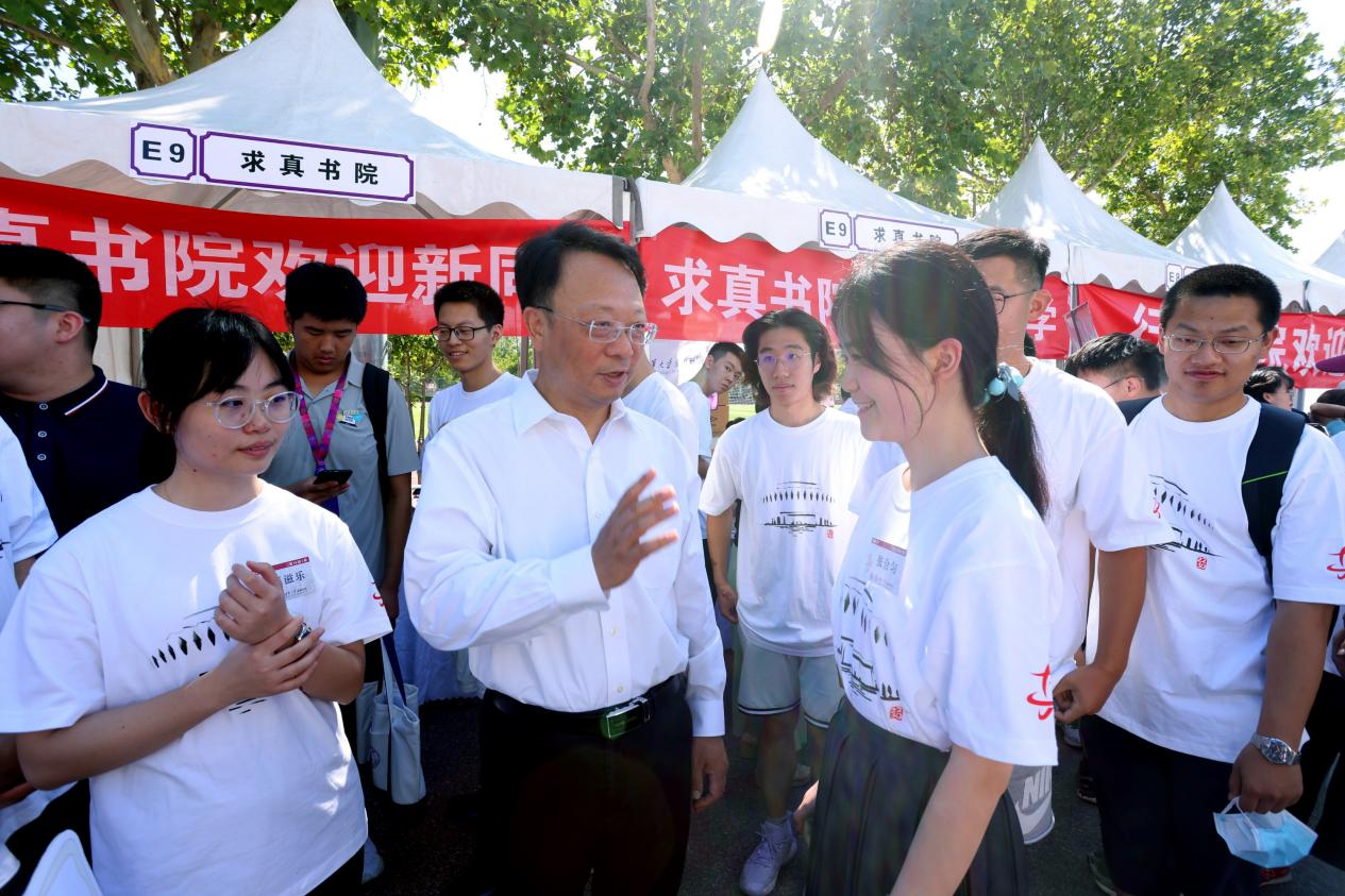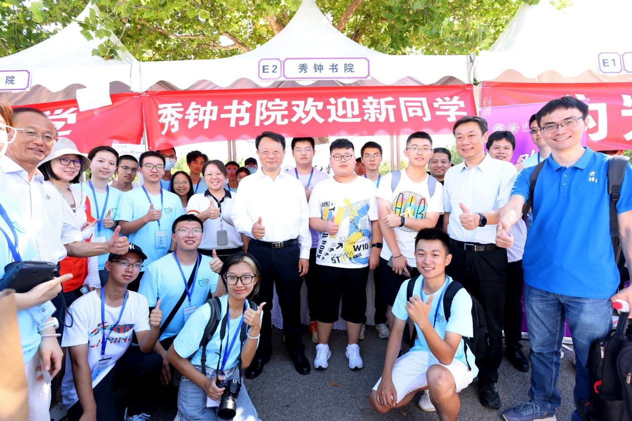 在学生服务中心前的迎新报到点,王希勤一行分别在求真书院、未央书院、秀钟书院、经管我司、临床医学类、电子信息类的迎新点前,详细了解各院系单位迎新工作进展、新生报到情况等,与新生及志愿者亲切交谈。求真书院的张合匀表示,希望未来能在数学世界中求真探索,为国家民族发展、为人类科学进步作出贡献。